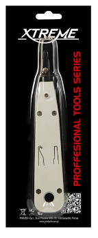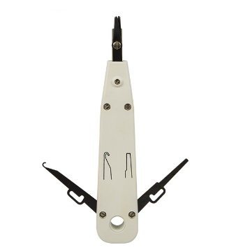 Ferramenta de cravar para fios de telefone com uma faca de cravar. O dispositivo insere o fio no terminal e corta seu excesso. Permite alterar a lâmina dependendo da aplicação. Garras auxiliares adicionais incorporadas.