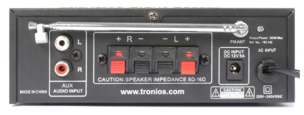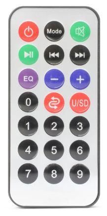 Versátil amplificador de áudio HiFi com leitor de MP3 por USB/SD/MMC. Equipado com entrada AUX, rádio FM, controlo remoto, entrada de alimentação de 12V e ajuste de graves e agudos.
