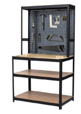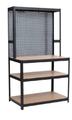 Bancada com parede para ferramentas, 3 prateleiras e 1 tampo de mesa