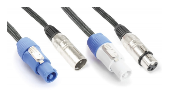 Cabo de alimentação e sinal numa só conexão de 1,5 metros. Não necessita nenhum outro cabo para conectar as suas colunas activas, sua mesa de mistura, etc.