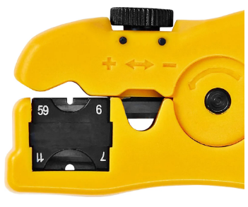 Este descarnador de cabos coaxiais de duas pontas totalmente ajustável é capaz de remover o isolamento de 4, 6, 8 e 12 mm de diâmetro. Não poderia ser mais fácil de usar - basta conectar a ferramenta ao cabo, girar no sentido horário e remover a parte indesejada.