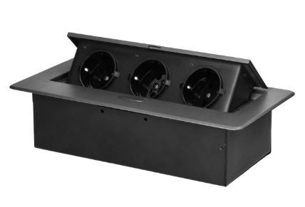 A tomada de encastre para móveis de fecho permite a ligação de três dispositivos ao mesmo tempo, pois está equipada com três tomadas tipo Schuko com ligação à terra (3x2P+Z).