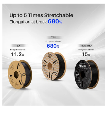 Com uma dureza Shore de 95A, o filamento TPU da ELEGOO oferece o equilíbrio perfeito entre flexibilidade e rigidez. Pode ser esticado até 5 vezes o seu tamanho original sem quebrar, tornando-o ideal para produzir peças que requerem uma elasticidade excecional e a capacidade de suportar deformações.