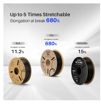 Com uma dureza Shore de 95A, o filamento TPU da ELEGOO oferece o equilíbrio perfeito entre flexibilidade e rigidez. Pode ser esticado até 5 vezes o seu tamanho original sem quebrar, tornando-o ideal para produzir peças que requerem uma elasticidade excecional e a capacidade de suportar deformações.