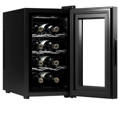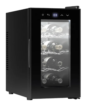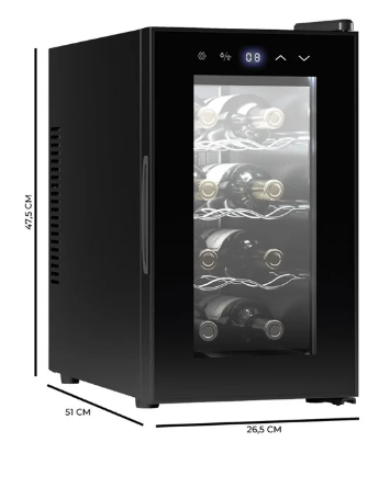 Garrafeira com controlo da temperatura. Capacidade de 8 garrafas com sistema termoelétrico de refrigeração, que garante um elevado desempenho. Temperatura regulável e luz LED interior.