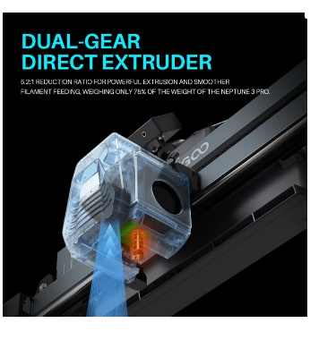 A extrusora Dual Gear Direct Drive proprietária da Elegoo do Neptune 4 Pro é 25% mais leve que a extrusora do Neptune 3 Pro. Ele garante maior força de extrusão, resultando numa taxa de extrusão de 5,2x e maior precisão de impressão.
