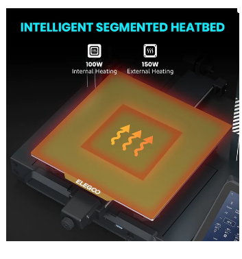 Tanto o Neptune 4 como o Neptune 4 Pro têm um leito de aquecimento de 250 watts que aquece até 110 °C num tempo muito curto. A principal diferença entre os dois é que a cama de aquecimento inteligente do Neptune 4 Pro tem 2 áreas de aquecimento independentes: enquanto uma funciona com 100 watts, a outra aquece com 150 watts. Com este sistema inteligente, podes reduzir significativamente o consumo de energia, aquecendo apenas a área necessária para o tamanho do teu modelo.