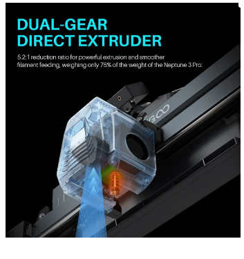 A extrusora Dual Gear Direct Drive proprietária da Elegoo do Neptune 4 Pro é 25% mais leve que a extrusora do Neptune 3 Pro. Ele garante maior força de extrusão, resultando numa taxa de extrusão de 5,2x e maior precisão de impressão.