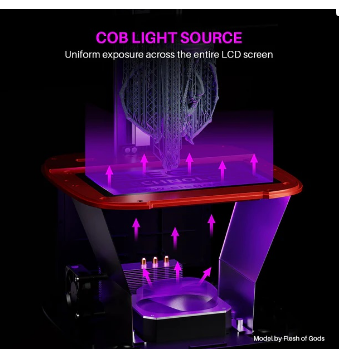 A impressora utiliza uma potente fonte de luz COB que emite um feixe de luz UV uniforme de 405 nm de comprimento de onda para uma elevada utilização e saída de luz. A fonte de luz consiste em 36 LEDs localizados sob o ecrã LCD para o iluminar uniformemente.