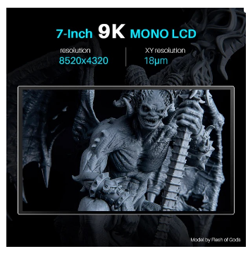 A Mars 4 está equipada com um ecrã LCD monocromático HD de 7 polegadas 9K (8520 x 4320 pixels) com uma notável resolução xy de 18 x 18 µm. Mesmo a uma velocidade de impressão de 70 mm/h, é possível ver pormenores finos com margens nítidas!