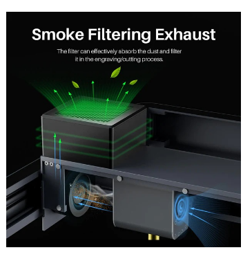 O filtro de exaustão de fumo da máquina e dois ventiladores de resfriamento na cabeça do laser filtram e exaurem efetivamente os gases e poeira gerados durante a gravação. Após a gravação, os ventiladores funcionam por mais um minuto para prolongar a vida útil do ventilador, reduzir o ruído e economizar energia. O cartucho do filtro possui uma tampa removível para fácil remoção e substituição do filtro.