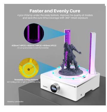 Com a ajuda do Mercury XS Bundle da Elegoo, seus modelos de resina serão curados uniformemente devido ao posicionamento dos LEDs UV e do toca-discos. Além das duas fileiras de LEDs montadas verticalmente, seu modelo é iluminado por baixo por uma fileira adicional de LEDs. A construção da plataforma giratória sempre mantém seus modelos em posição e garante que nenhum modelo escorregue.