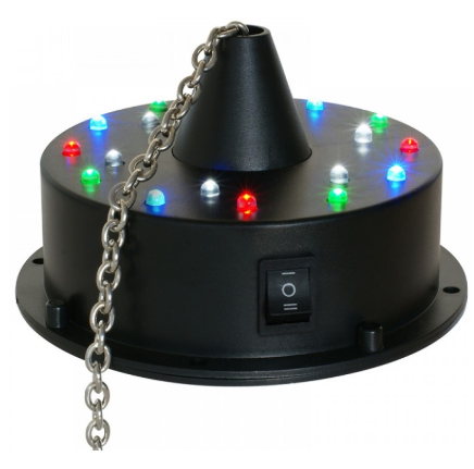 Motor a bateria de baixo ruido para bolas de espelhos de até 2 kg que incorpora 18 LEDs de cores. Especialmente na escuridão produz um efeito imponente. Funciona automaticamente ou activado pela musica.