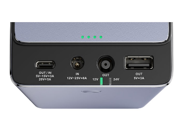 A Powerbank está equipado com 4 portas - porta de entrada DC (12-25 V, 6 A), porta de entrada/saída USB-C (potência máxima de 100 W), porta de saída USB-A (potência máxima de 15 W ) e porta de saída DC (potência máxima de 144 W). O modelo PowerPack Plus também suporta vários padrões de carregamento rápido, incluindo PD e QC. Assim, não precisa de esperar muito tempo para que o seu equipamento esteja pronto a usar!