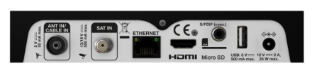 - Ligações: ANT IN/CABLE IN, SAT IN, HDMI, S/PDIF (coax.), 2x USB, leitor de cartão SD, fonte de alimentação 12 V, Wi-Fi, Bluetooth