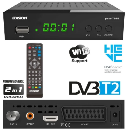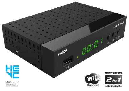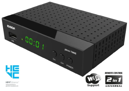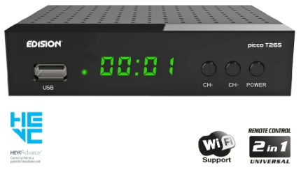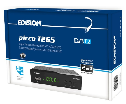 EDISION PICCO T265+ é o novo receptor EDISION para receber o sinal Digital Terrestre e de Cabo Full High Definition DVB-T2/C H265 HEVC 10 Bit. Cuidadosamente projetado, PICCO T265+, o Receptor Digital Terrestre e a Cabo H265 HEVC 10 Bit (certificado e aprovado pela TV Bonus) suporta WiFi USB para acesso a aplicativos do YouTube, atualizações de software meteorológico e on-line com a adição opcional de antena WiFi EDI-Mega, enquanto ele tem funções de Media Player e gravação PVR. Ele foi projetado com ênfase especial na facilidade de uso, pois vem com o controle remoto 2 em 1 ergonômico e fácil de usar para operar o receptor com quatro configurações padrão LG/SAMSUNG que também podem ser programáveis. O display LED de 4 dígitos de fácil leitura e os botões ON/OFF & channel +/- na parte frontal melhoram a experiência geral do usuário e de visualização.