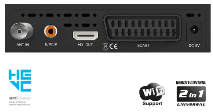 - Portas: ANT IN, HDMI, SCART, SPDIF, USB, IR, DC 5V