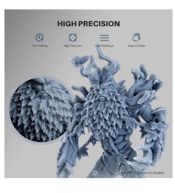 Baixo encolhimento e alta precisão: resina de fotopolímero ELEGOO contém monômeros de metacrilato para reduzir o encolhimento do volume durante o processo de fotopolimerização, o que garante a alta precisão modelo de impressão com acabamento liso.
