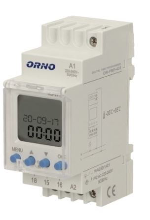 Programador com display LCD projetado para montagem em calha DIN padrão. Ele é usado para ajustar o tempo ON / OFF de aparelhos elétricos, como iluminação, aquecedores de água, motores, bombas, etc.