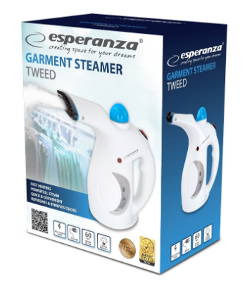 O vaporizador de roupas Esperanza TWEED é um aparelho prático e de fácil utilização para passar e refrescar roupas, cortinas, estofados e cobertores. Aquece rapidamente e está pronto para operação em apenas 60 segundos. O vaporizador gera vapor de alta pressão, permitindo remover rapidamente as rugas sem abrir a tábua de passar. É adequado para qualquer tecido.